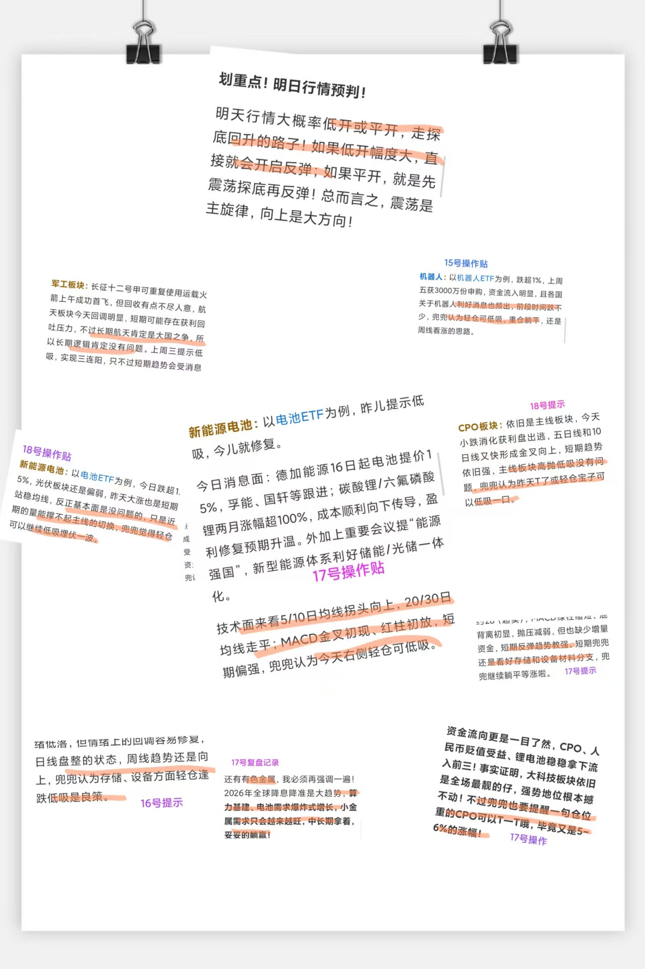 咱的节奏把控向来精准到离谱!不止今天大涨的机器人,前两天的电池、有色金属、半导体材料、CPO,兜兜上周就挨个精准提示,每一个都稳稳踩中上涨节奏,吃到满满红利!上周五板块大涨,全网都喊减仓避险,只有兜兜坚定喊出周线看涨;昨天继续强力看多,今天果然又拿下稳稳的收益,实力从不缺席!