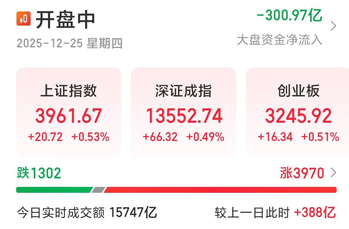 A股午后三大指数都变得红彤彤,走势完美复刻兜兜昨晚复盘预判:早盘低开后反弹,丝毫不差!北向资金圣诞休市缺席,场内资金依旧给力,量能温和放大,超3900只个股飘红,支线赛道赚钱效应拉满,妥妥的暖意在线!