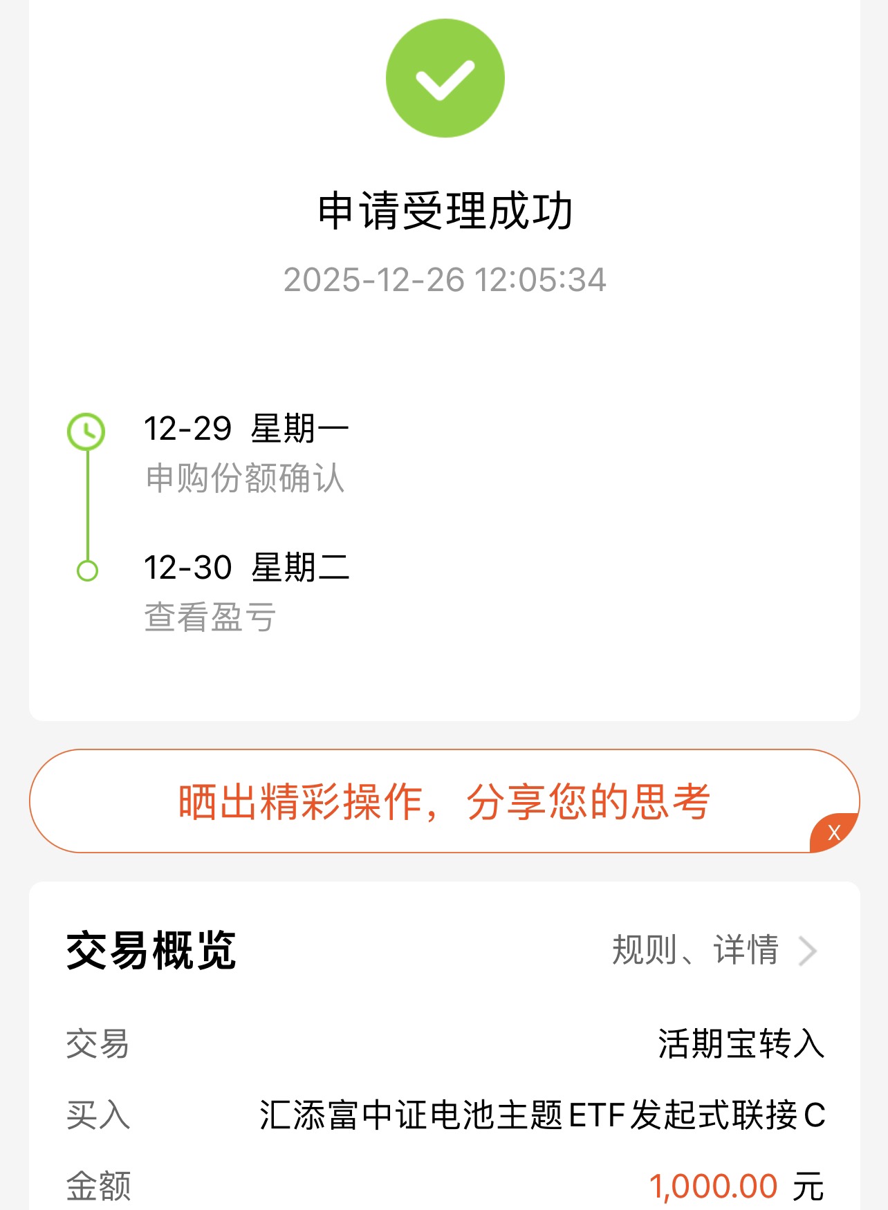 指数成分股质地也很硬,阳光电源、宁德时代、亿纬锂能、先导智能等新能源“四大天王”均位列前十大权重。顺着趋势走,今天我选择继续加仓1000元,耐心等待板块行情进一步发酵。