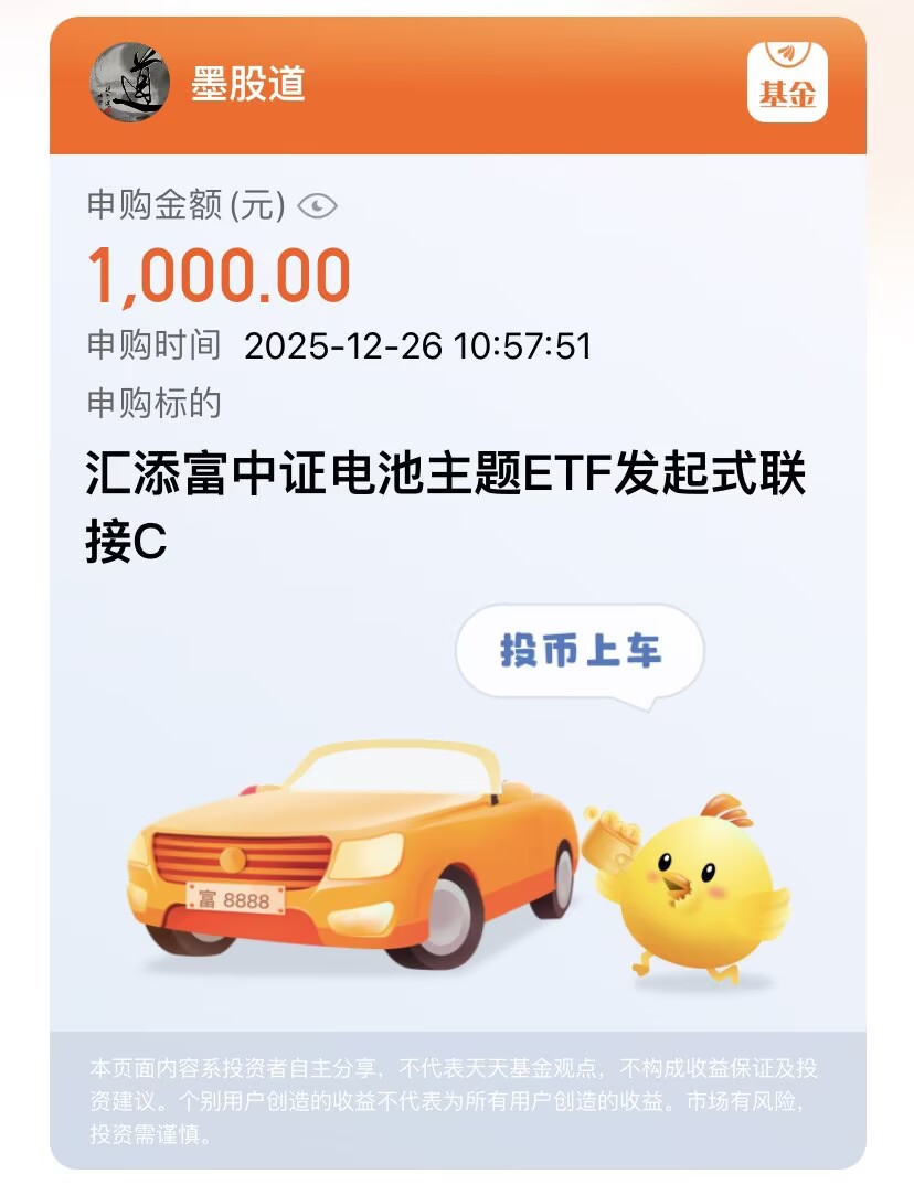 其实资金动向早有端倪,都在悄悄往固态电池、锂电方向挪。我重点关注的$汇添富中证电池主题ETF发起式联接C(OTCFUND|012863)$,今日估值涨了 2.91%,在同类基金里涨幅领先,近一周涨 6.26%、近六月涨 59.37%,数据实实在在跑赢同类型产品。