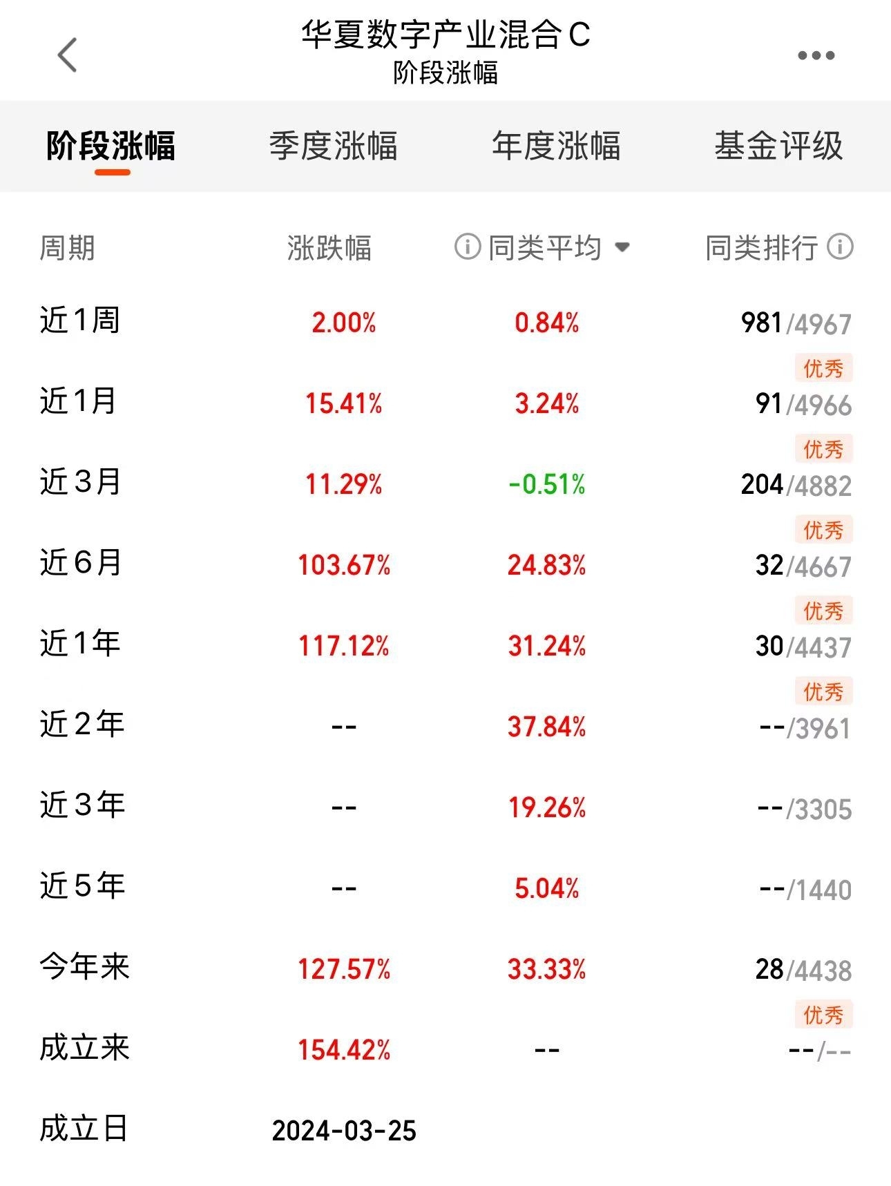 今天继续上扬等两天连涨行情了,这基短期业绩亮眼,近半年收益翻倍103%+,聚焦AI算力,弹性不错,是我的持仓收益最好的基金,各阶段也都很优秀,继续加油冲吧$华夏数字产业混合C$