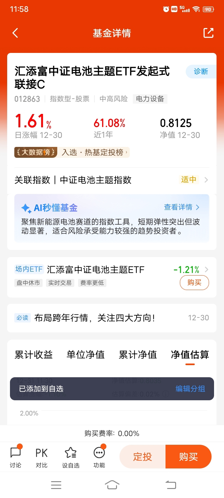 #2025给我赚最多的基金# #汇财友道# 2025年的投资路上,$汇添富中证电池主题ETF发起式联接C$ 绝对是我的“收益主力军”,这只基金让我真切尝到了赛道投资的甜头。年初我还在犹豫是否重仓新能源电池板块,毕竟此前行业经历了一波调整,但看到全固态电池技术研发不断传来突破消息,再结合全球新能源汽车和储能行业的高景气度,我还是决定坚定布局,不仅在低位分批买入,还设置了定投计划。没想到这一年里,电池板块借着技术迭代和产业政策利好迎来了修复行情,这只基金近一年61.08%的收益率,成了我2025年投资成绩单里最亮眼的一笔,尤其是12月30日还收获了1.61%的日涨幅,让我更确信选对了方向。