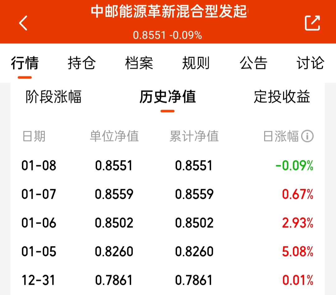 昨天补仓电池的,今天吃肉,拿的固态电池的$中邮能源革新混合型发起C$ ,各阶段业绩都不错,近一周都涨了近9个点