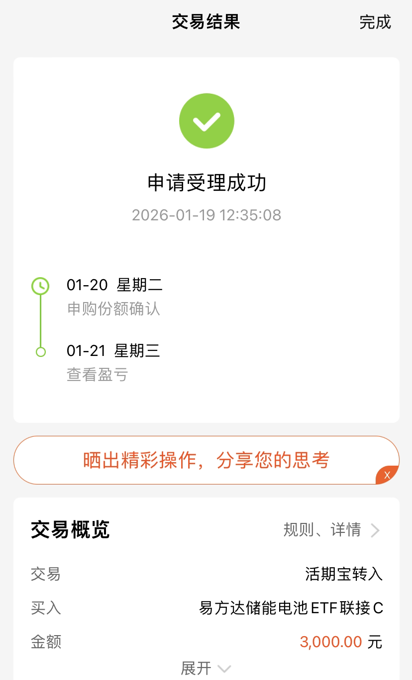 今天盘面表现不错,A 股低开高走走出修复行情,整体走势稳住了。电池板块逆市上涨,表现优于中证电池和新能车电池指数。易方达储能电池 C 是全市场唯一主投储能的产品,投储能就选这只跟踪储能电池指数的基金。从中长期来看,当前上涨才刚刚开始,完全可以逢低加仓布局,静待后市芝麻开花节节高升。