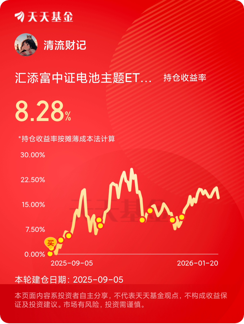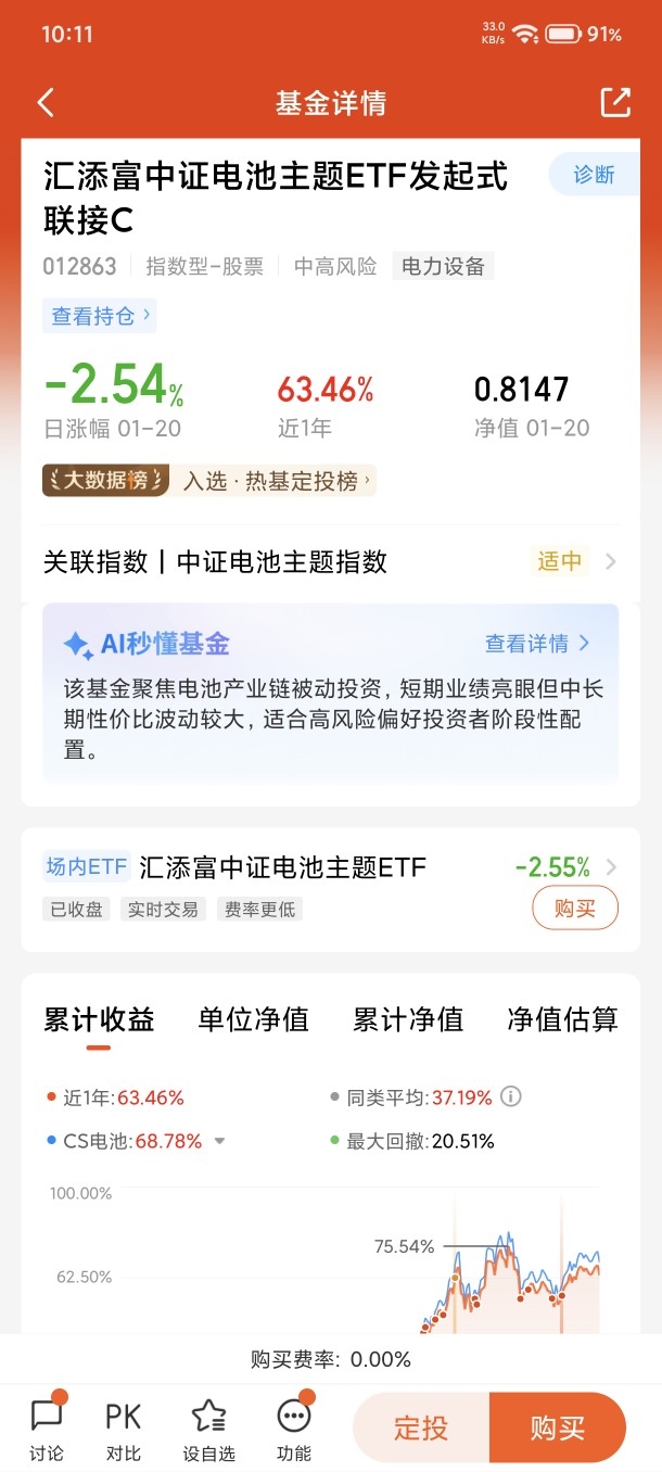 2025年“最满意”的投资操作,就是坚定持有代表未来产业方向的AI、半导体等核心资产。其中我选择重仓持有汇添富中证电池主题ETF发起式联接C(012863)目前整体收益还不错。