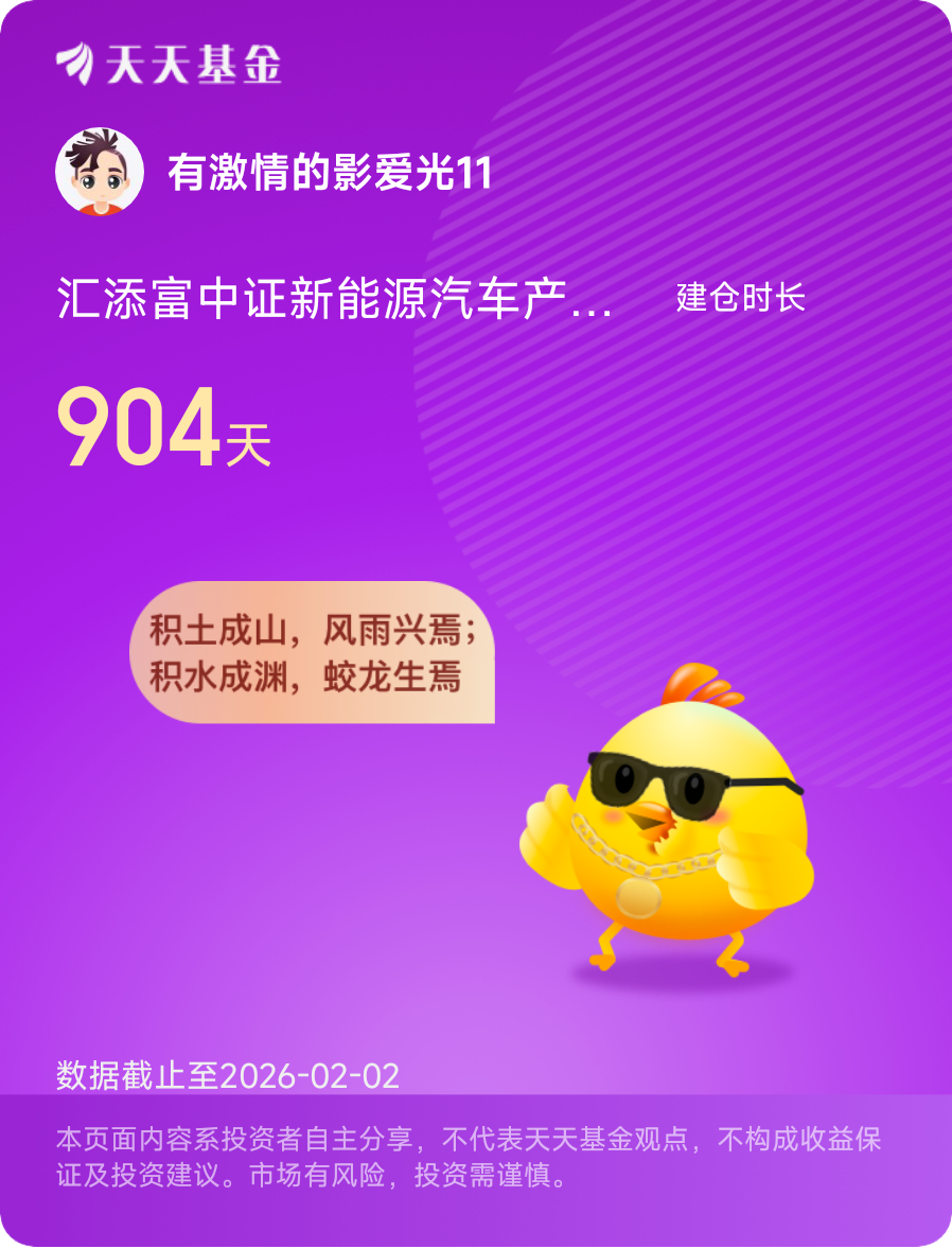 站在2026年初回望2025,与汇添富电池C共度的这一年,有焦虑、有犹豫,但更多的是坚守后的喜悦与感悟。这只基金就像一位靠谱的“赛道伙伴”,在行业低谷时陪伴我扛过压力,在行情上涨时带我分享红利,用专业的运作和稳定的表现,证明了“选择优质赛道+长期持有指数基金”的可行性。对于普通投资者而言,我们或许无法精准预判市场涨跌,但只要选对契合时代趋势的赛道,找到一只运作稳健、跟踪精准的指数基金,然后摒弃短期波动的干扰,耐心陪伴行业成长,就一定能在投资长跑中收获属于自己的收益。