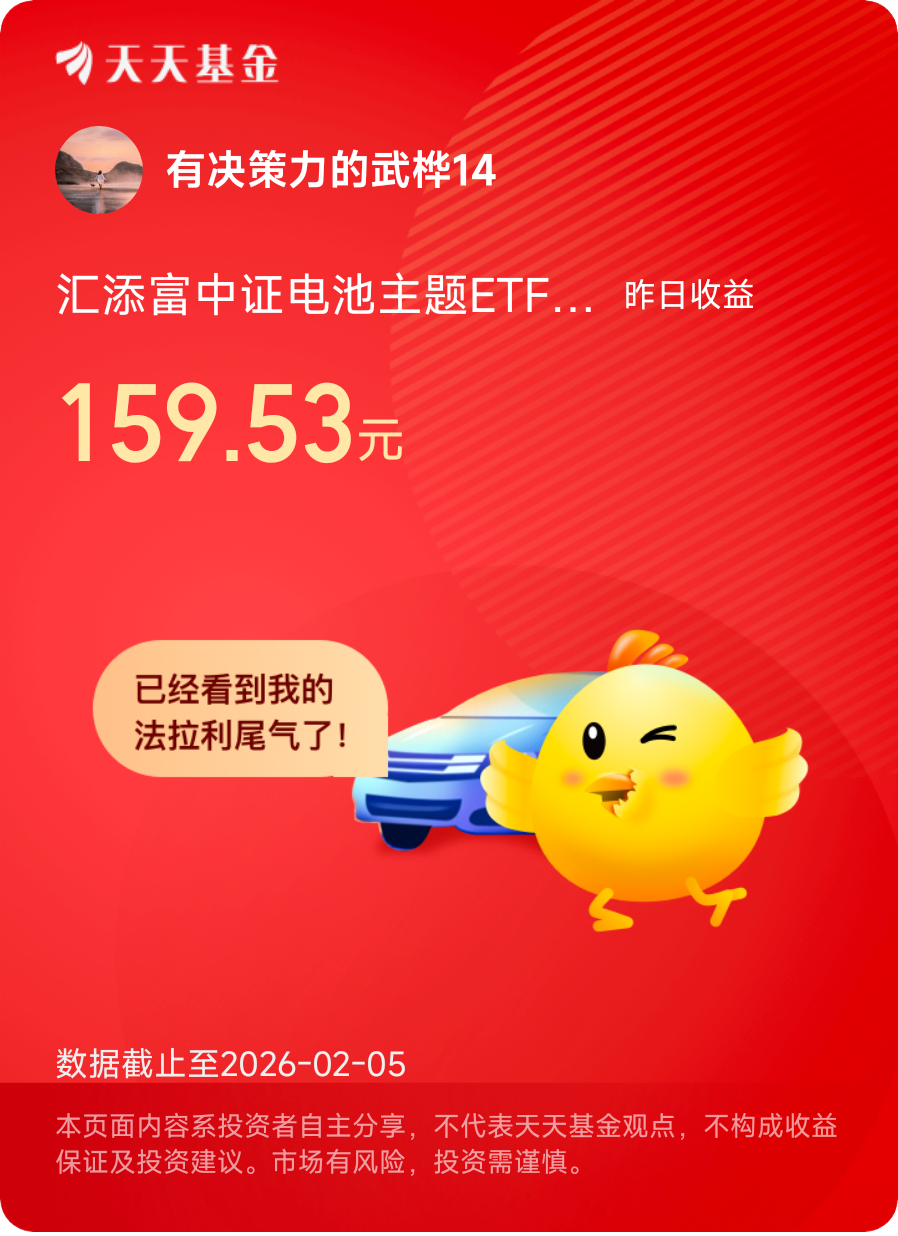 投资从来不是一蹴而就的博弈,而是与时间做朋友、与产业共成长的修行。2025年的锂电记忆,有震荡、有波折、有惊喜,更有坚守后的收获。感谢汇添富中证电池主题ETF发起式联接C的全程陪伴,让我在高弹性赛道中,既享受了成长的红利,也守住了投资的底线。2026年,愿所有坚守新能源、相信长期价值的投资者,都能选对工具、拿住筹码、穿越波动,收获属于自己的时代收益。@汇添富基金