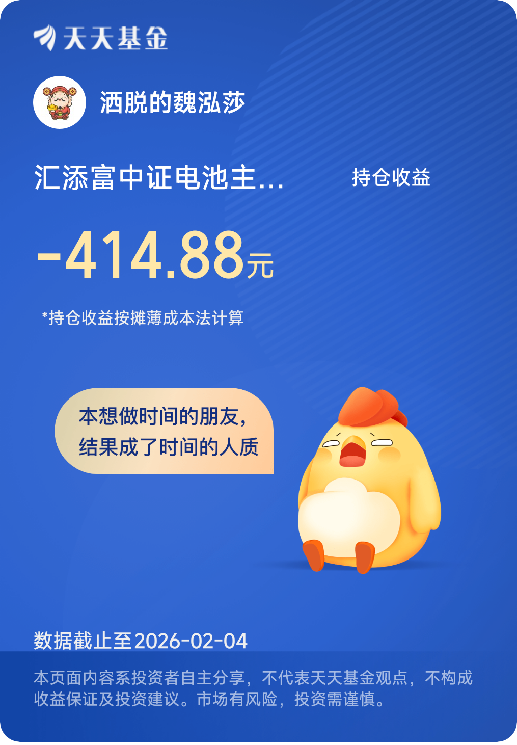 2025年的投资历程,是我与电池赛道共同成长的一年,也是我与汇添富中证电池C相伴前行的一年。这一年,我见证了电池赛道的技术突破与产业升级,经历了板块震荡与心态考验,也收获了长期持有带来的收益与成长。通过这一年的体验,我更加坚定了对电池赛道长期价值的看好:在“双碳”目标的大背景下,新能源替代传统能源是不可逆的趋势,而电池作为新能源汽车、储能等领域的核心部件,其成长空间无限;同时,我也更加认可指数基金在赛道布局中的核心价值,汇添富中证电池C这样的产品,能够让普通投资者低成本、高效率地分享赛道的成长红利,是布局细分赛道的优质标的。