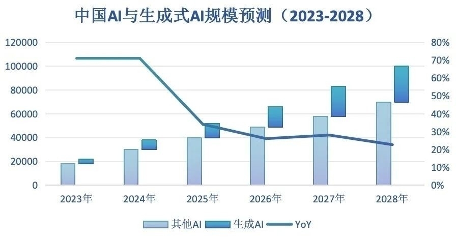 根据国际知名咨询机构IDC发布2025年V1版《全球人工智能和生成式人工智能支出指南》,IDC预计到2028年中国人工智能总投资规模将突破1,000亿美元,五年复合增长率达32.9%,其中生成式AI投资规模超300亿美元,中国将继续引领亚太地区人工智能市场发展。