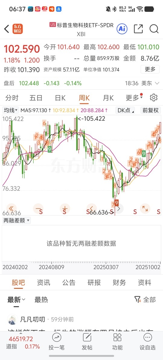 从4月份低点66.63$到现在102.59$,标普生物科技也涨了近54%,虽然没