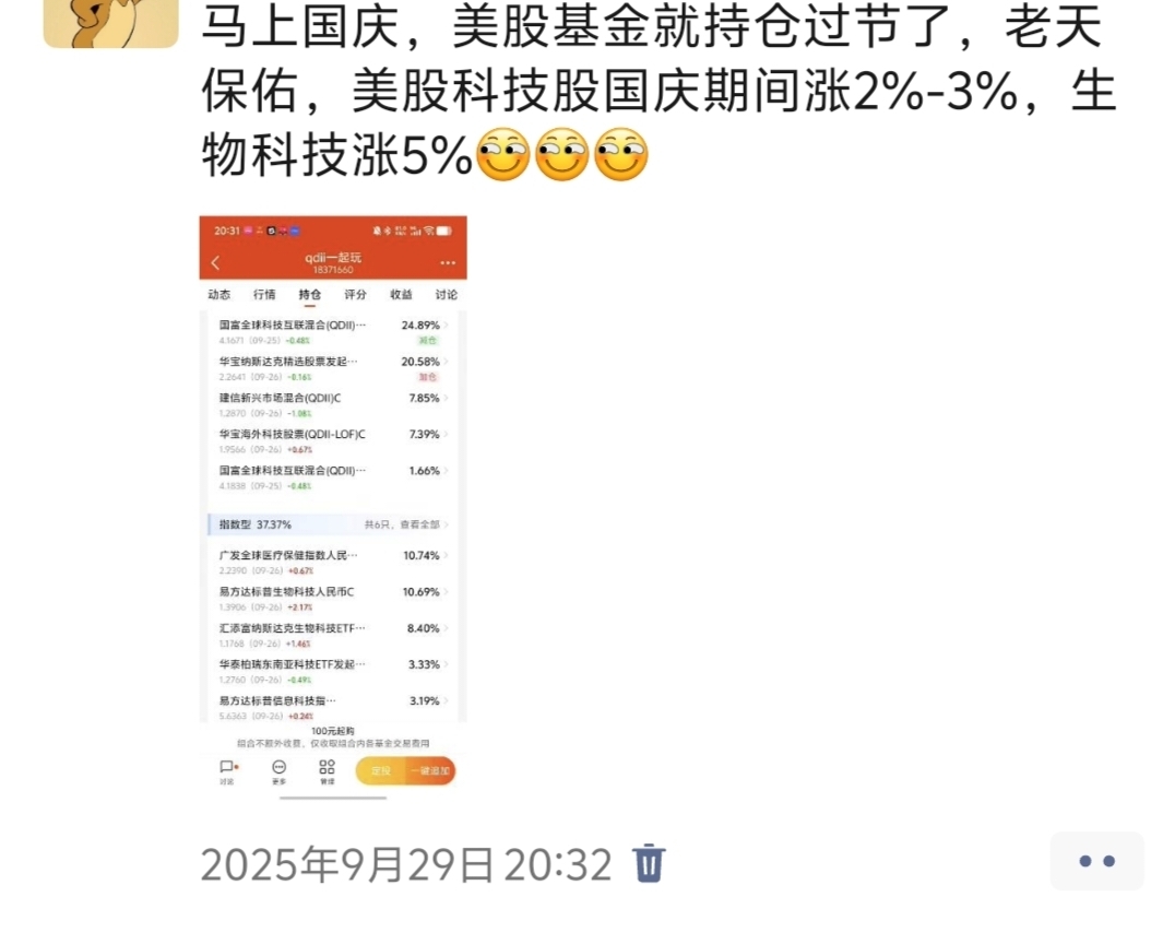 国庆节前我许愿美国科技股涨2-3%,生物科技涨5%以上。现在来看,从9月30日到10月8日,标普生物科技涨了7.17%,纳斯达克100指数涨了2.13%左右,许愿圆满成功。我宣布,国庆节消费,由美股医药买单(早知道许愿涨幅更大一点
