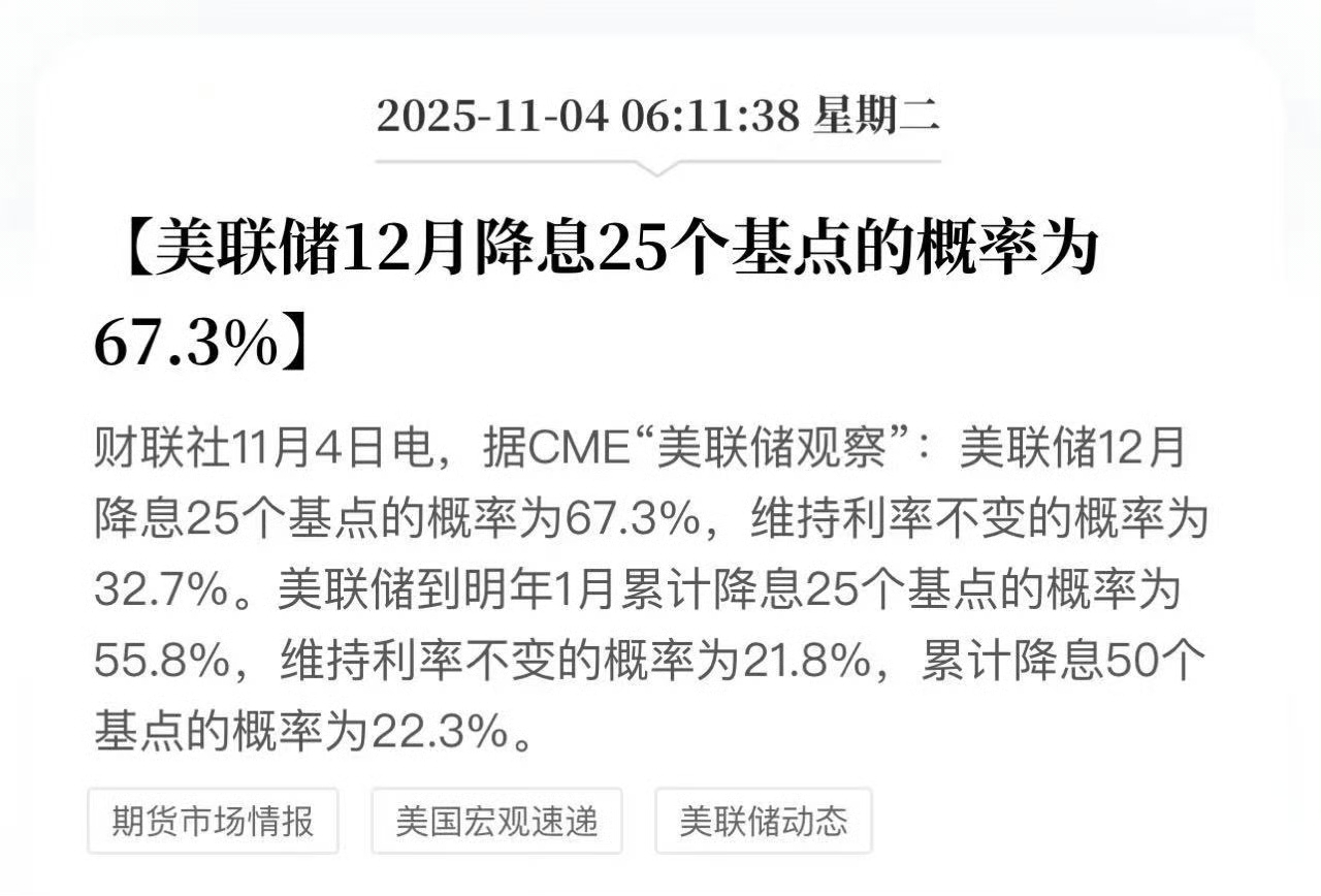 美联储12月降息25个基点的概率仅为67.3%。后面又要博弈这息降还是不降了…,