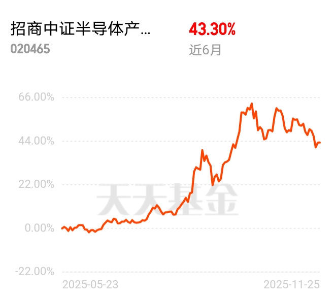 半导体行业发展势头正劲,板块涨势喜人,赚钱效应拉满。招商中证半导体产业ETF联接C近6个月涨43.30%,短期能抓住摩尔线程申购的风口,长期中芯国际、华虹半导体产能饱满,需求旺盛撑行情。