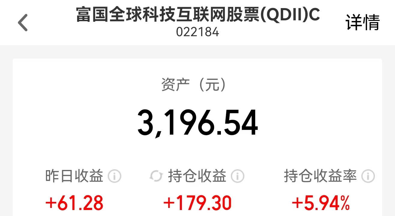 说下权益吧,热度不减,此前打埋伏的$富国全球科技互联网股票(QDII)C(OTCFUND|022184)$ ,昨日涨幅高达1.95%,个人持有一个月收益率也达到5.94%了,势头很猛。