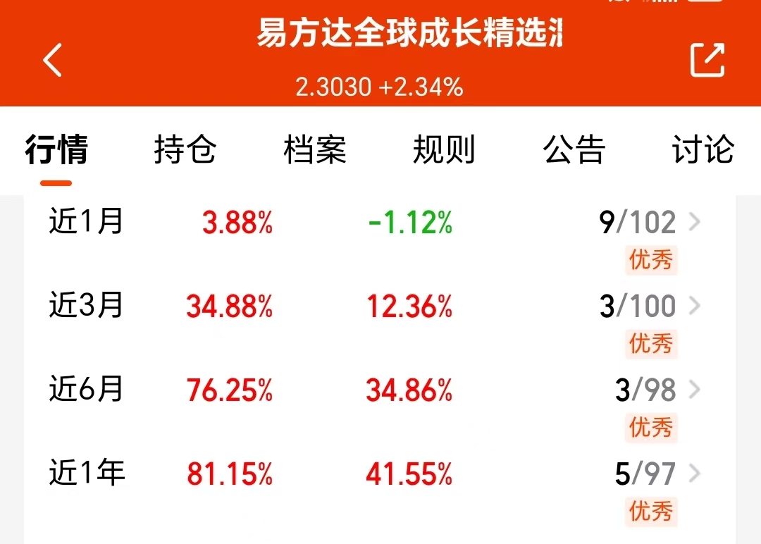 今天A股低开低走,昨夜美股三大指数调整,不过我觉得布局科技还是要视野更广一点,海外科技发展迅速,机会也不少呢。像$易方达全球成长精选混合(QDII)人民币A(OTCFUND|012920)$近一年涨81.15%,长期业绩突出,虽近期限购,但胜在无需择时,我也打算开启定投了。近期A股因外部因素干扰,科技股波动加剧,这个可全球配置科技股,基金经理预判精准,多个市场灵活调仓,也是能有效规避高位风险的。