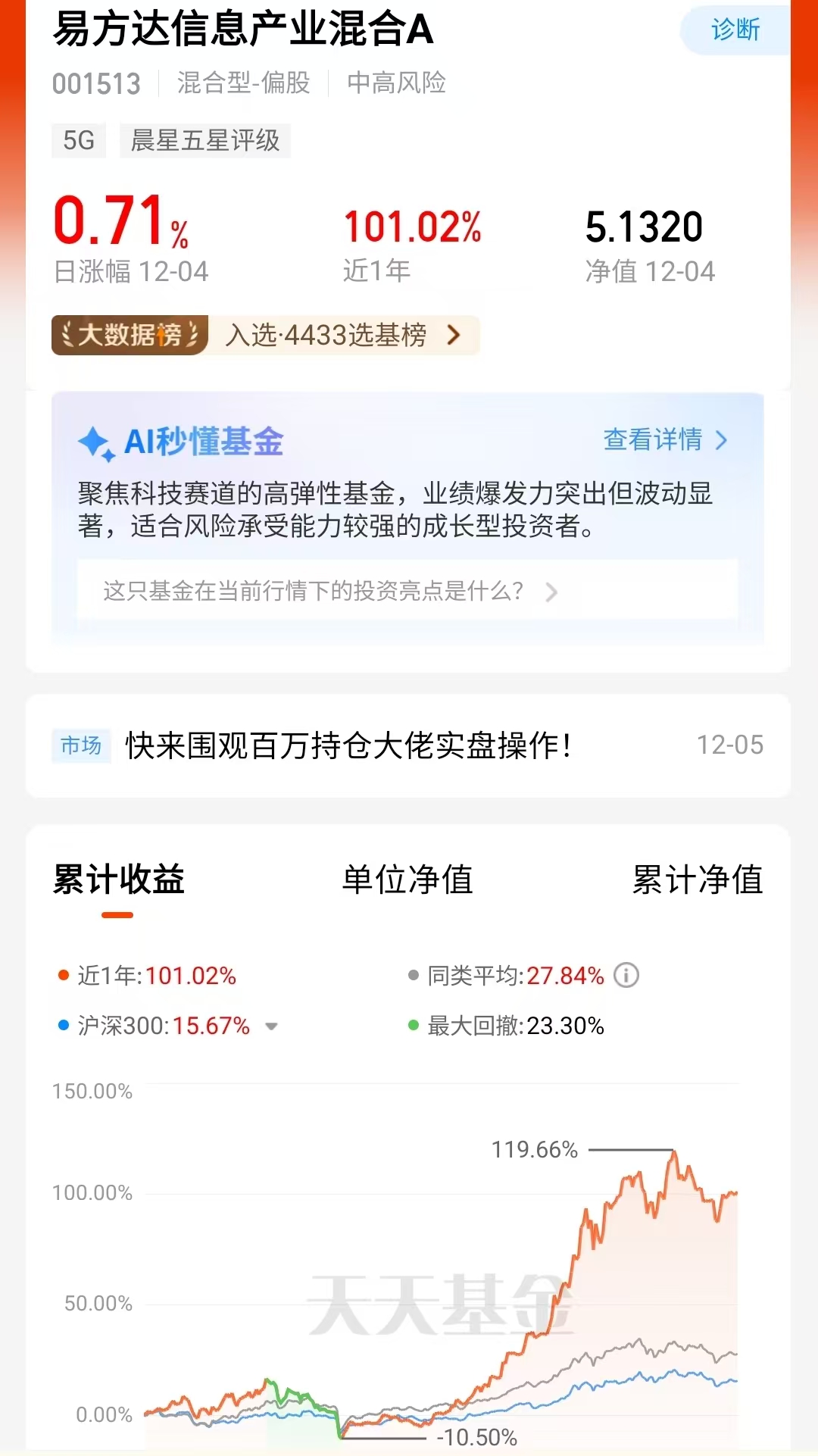 友友们,最近股市行情波动,但是我觉得科技板块行情并没有结束,科技是主线,是国家发展重点,我之前上车了$易方达全球成长精选混合(QDII)人民币A(OTCFUND|012920)$布局全球科技,基金经理通过全球范围调仓精准控制回撤,同样是他管理的易方达信息产业混合A也不错,昨天上涨0.71%,近一年上涨101.02%,我也准备加仓了。