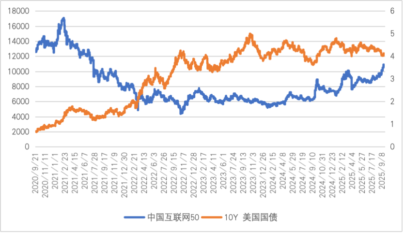 图:近五年中国互联网50指数与10年期美债收益率走势对比