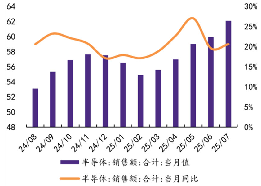 全球半导体销售额同比保持快速增长,半导体行业景气度提升显著。国际半导体产业协会(SEMI)预计,由人工智能驱动的芯片创新需求将持续推动产能扩张和先进制程生产,2025年全年全球设备销售额或达1255亿美元,刷新纪录。