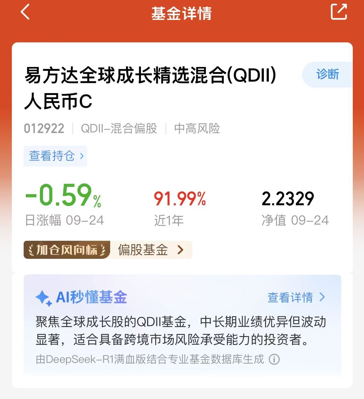 今天A股和港股都是震荡盘面,板块分化,所以还是多元化市场会相对给力呀,$易方达全球成长精选混合(QDII)人民币C(OTCFUND|012922)$是投资全球科技市场的,主要是布局科技方向为主的,近三个月涨幅45.48%,近一年涨幅91.99%,业绩优秀,而且经理的管理能力也不错,降息周期开启后,全球科技更有希望呢,我继续看好这个方向。
