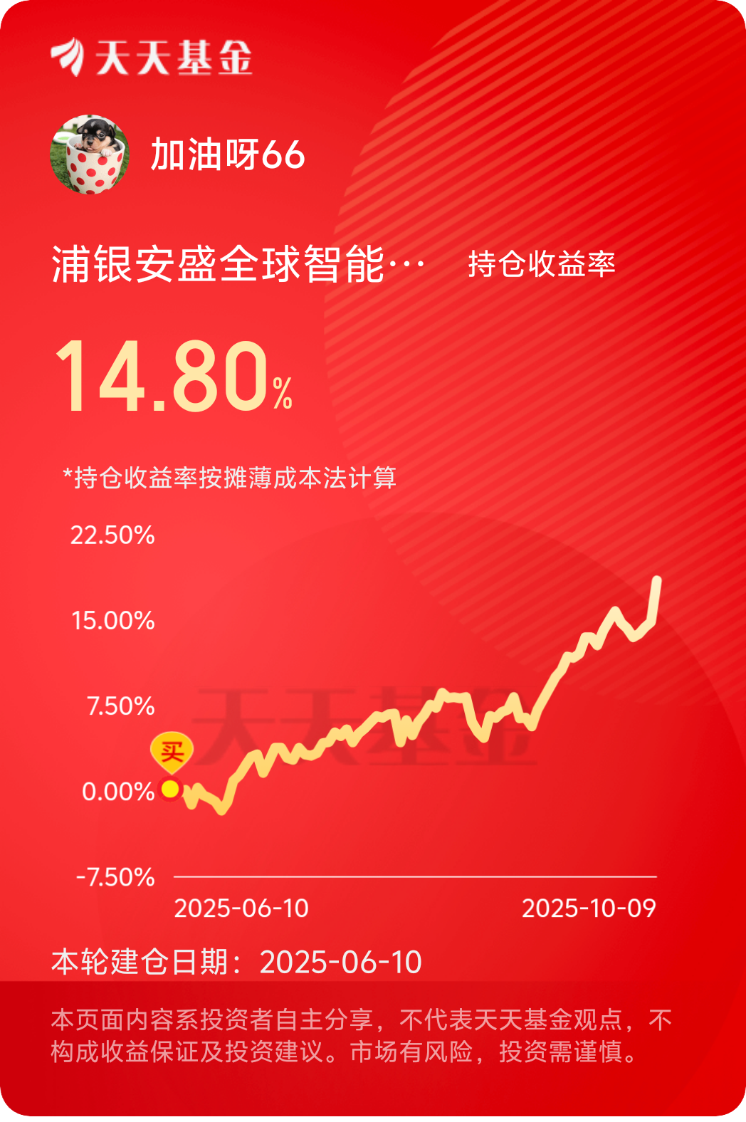 ,只要AI基本面没问题,美股长牛持有体验就可以的,国内科技股波动大下不去手的可以配置下美股科技,定投参与也很稳,浦银安盛全球智能科技完全不限购,操作灵活,轻松跟上$浦银安盛全球智能科技(QDII)C$ #晒收益#