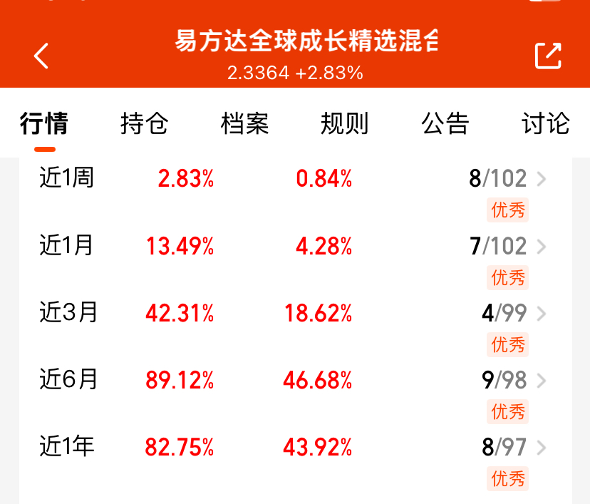 今天股市低开调整,但是午后半导体拉升了不少,总感觉大科技长期没走完,海内外机会层出不穷,近期回调正是上车好机会,其中$易方达全球成长精选混合(QDII)人民币C(OTCFUND|012922)$可以在全球范围调仓,也不用担心入在高位,基金经理调仓灵活且长期业稳健!