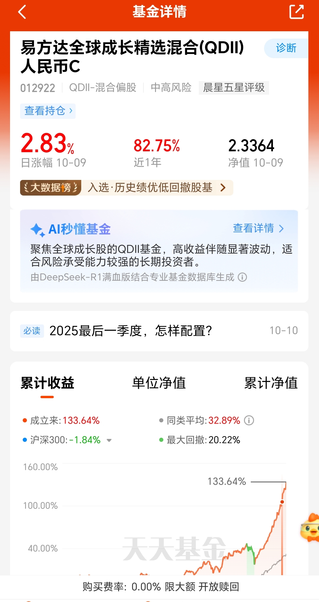 今天市场低开调整,稀土及有色想关逆市上涨,其他大多板块回调了。上周五美股也是集体回调,不过这倒是给了我低吸$易方达全球成长精选混合(QDII)人民币C(OTCFUND|012922)$的机会了,这基的配置思路挺贴合趋势,兼顾美股机器人先发优势、A 股算力刚需、港股互联网应用落地。国庆期间它跑赢美股港股,能看出控回撤和抓机会的能力,继续看好基金经理的灵活调仓能力~