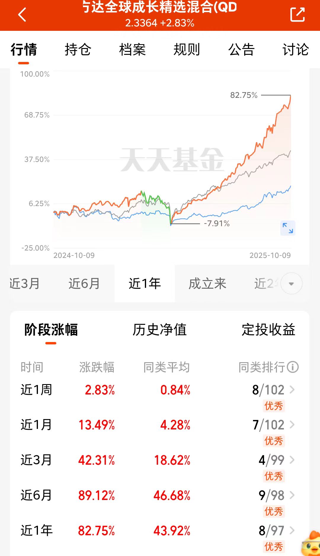 友友们,最近这两天全球股市震荡,单一市场风险过高,行情轮动,也有点难捕捉,所以布局全球科技的$易方达全球成长精选混合(QDII)人民币C(OTCFUND|012922)$就优势凸显,可以全球范围调仓,国庆期间大A休市,他就跑赢了美股和港股呢。刚好这两天因为事件影响有点调整,但也许是上车良机,我相信基金经理的调仓能力。