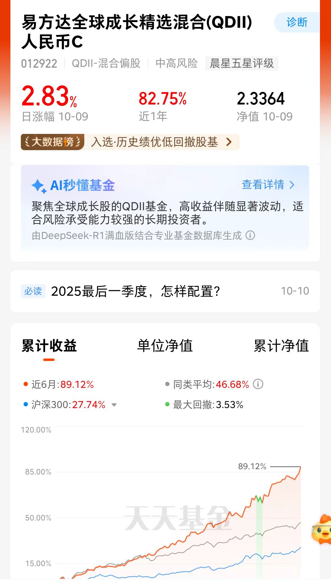 全球科技板块各有优势,美股的机器人、AI有先发优势,A股部分资产在算力建设中不可或缺、港股的互联网巨头是最受益AI应用落地的。单看一个市场容易踏空或者风险较高,那怎么办呢?不妨就选择$易方达全球成长精选混合(QDII)人民币C(OTCFUND|012922)$,他的策略是投全球科技(A、H、美股都能投)灵活规避政治风险,在我们国庆节期间业绩涨幅亮眼,跑赢美股和港股呢,而且科技长期没走完,海内外都有很大机会,所以就选这只布局全球科技的。