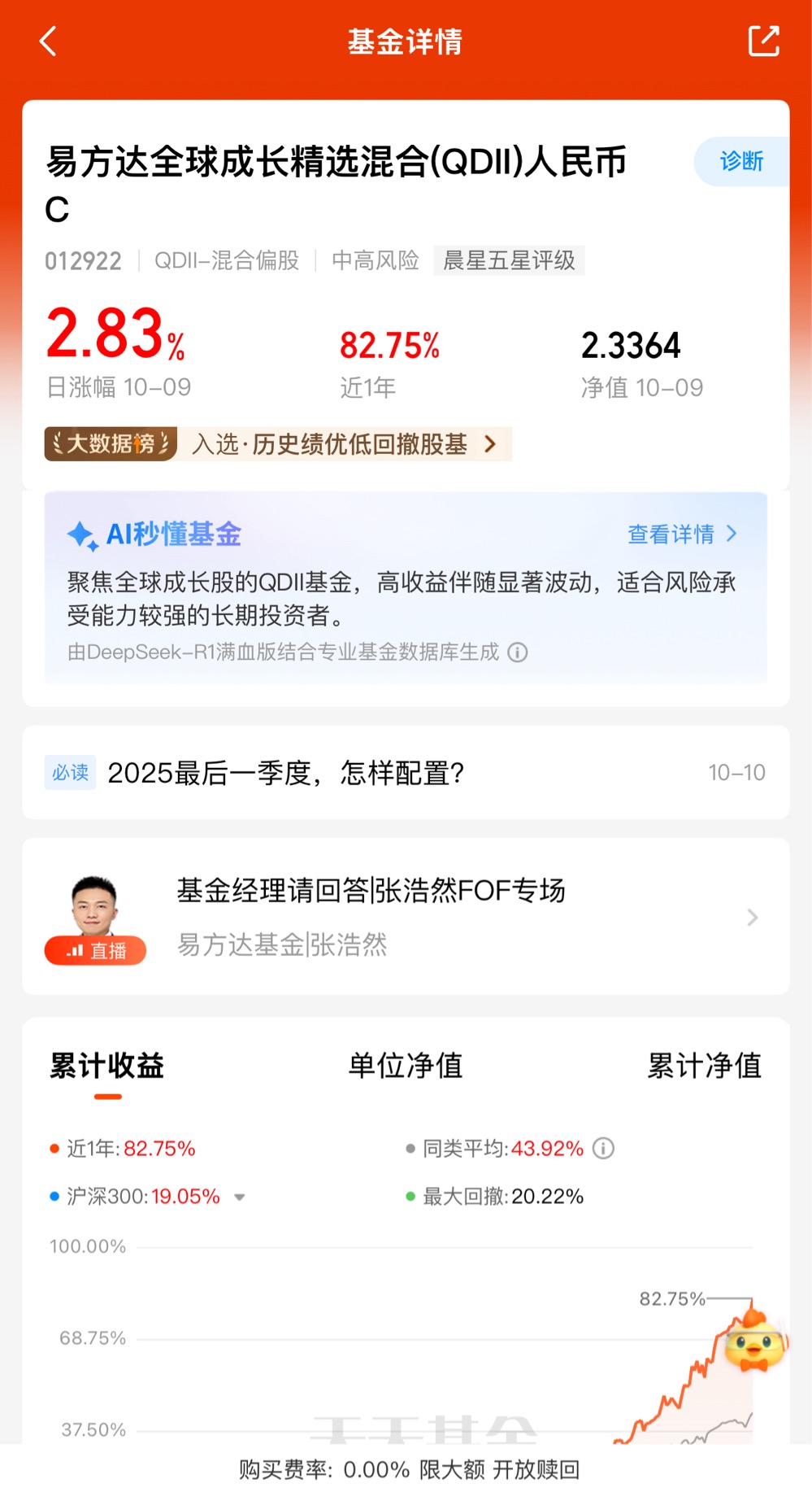 在当前降息周期开启的背景下,$易方达全球成长精选混合(QDII)人民币C$ 展现出独特配置价值: