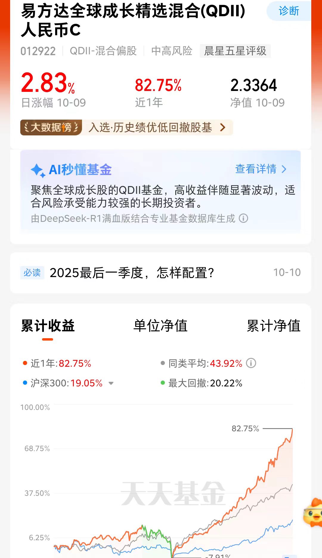 这两天股市行情因为事件影响有点调整,但是科技板块是主线,趁着调整加仓性价比更高呢,$易方达全球成长精选混合(QDII)人民币C(OTCFUND|012922)$是布局全球科技的稀缺产品,通过全球范围调仓就能及时把握多个市场机遇呢,基金经理调仓能力强,最近走势亮眼,可以关注一下。