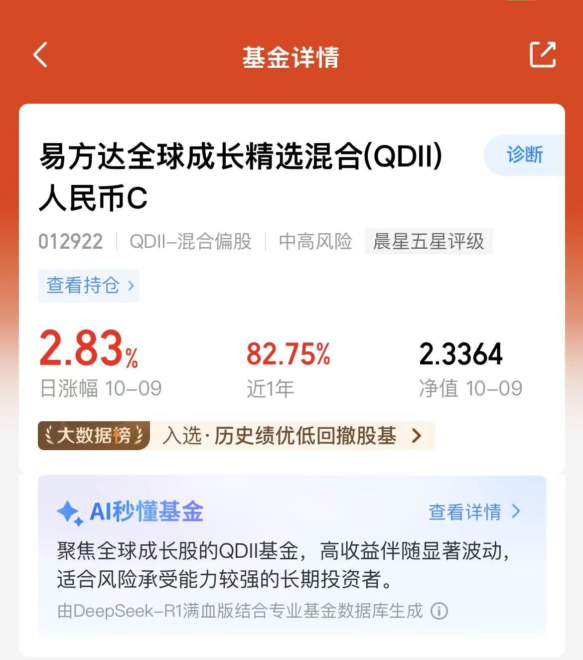 今天大A和港股都下跌调整了,盘面绿油油的,黄毛的一番话,美股也迎来调整,此时,我还是喜欢多市场的布局,$易方达全球成长精选混合(QDII)人民币C(OTCFUND|012922)$就是投资多地市场的,A、H和美股都能投,这样既能提高收益也能降低风险,经理的调仓灵活,而且业绩也优秀,年化收益率82.75%,我继续看好呢!