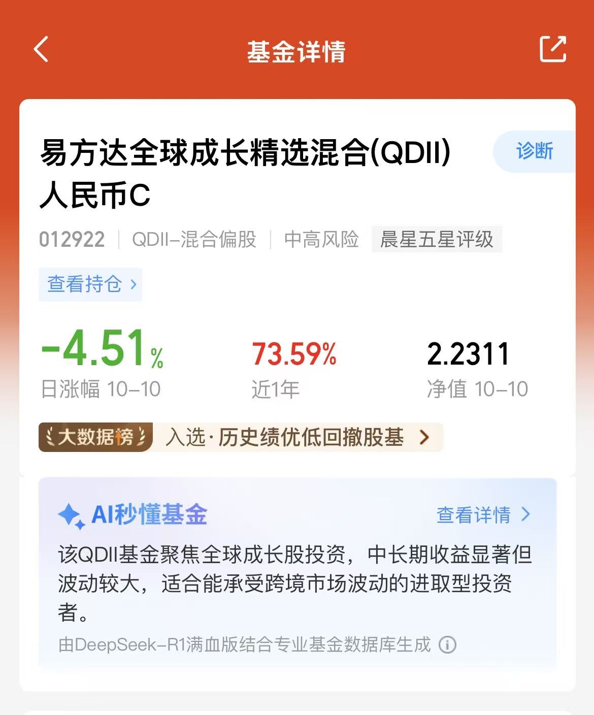 昨夜美股迎来不错的反弹啦,修复能力还是比较强的呀,不过A股这边今天高开低走了,所以我觉得单一的市场还是比较难的,$易方达全球成长精选混合(QDII)人民币C(OTCFUND|012922)$是投资全球市场的,覆盖A股、美股和港股科技方向的,近一年收益率73.59%,业绩优秀,反弹力强,经理的管理能力出色,我觉得科技还是眼下重要的主线,可以长期看好呢!
