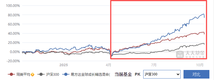 (3)基金收益上看,和同类产品以及沪深300相比,无论是短期还是长期,成绩都很亮眼,走势稳而强。短期来看,$易方达全球成长精选混合(QDII)人民币C(OTCFUND|012922)$国庆期间走势亮眼(+2.8%,跑赢海外主要科技指数)。长期来看,今年以来走势极其亮眼且稳。今年以来收益率65.76%,同类平均为40.09%,沪深300仅为16.75%。