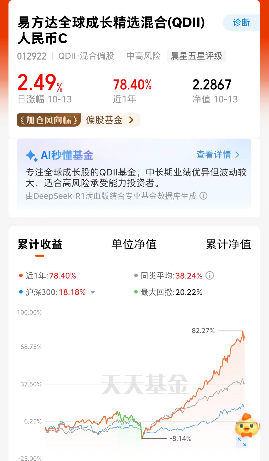 近期美股反弹啦,科技板块行情或将重启,但是单独看一个市场容易踏空或者风险过高,易方达全球成长精选混合(QDII)人民币C012922,是布局全球科技的,覆盖美股、港股、A股三地市场,一键布局AI算力、光模块、芯片,今年以来就持续上涨,通过及时调仓回撤控制的好,我们国庆假期期间更是跑赢美股跟港股呢,可以关注一下。