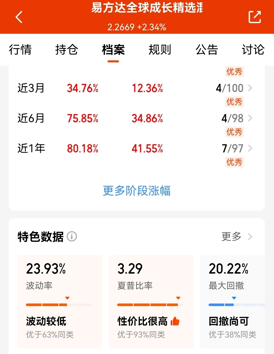 近期全球市场呈现震荡分化格局,科技板块也有所波动,但其近期涨势已经不少,目前的回调反而是健康趋势,而$易方达全球成长精选混合(QDII)人民币C$ 不但能把握全球科技成长机遇,并且长期业绩出色亮眼,自今年以来涨幅就高达68.42%,当前更是已经出现限购,可见其优秀程度,同时作为全球配置绩优低回撤产品,在当下非常具有稀缺性,我也打算果断定投起来,期待反弹力量!