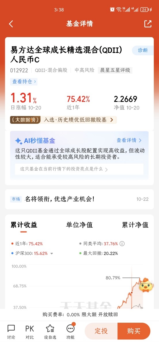 昨天股市反弹,今天就又窄幅震荡了,量能不足,行情还不是太稳。不过美股那边行情火热,所以投资要格局打开,我持有的$易方达全球成长精选混合(QDII)人民币C$ 这个基,就是投资全球科技,不仅有A股港股还是美股科技,能更好的稳定收益,抵抗风险。