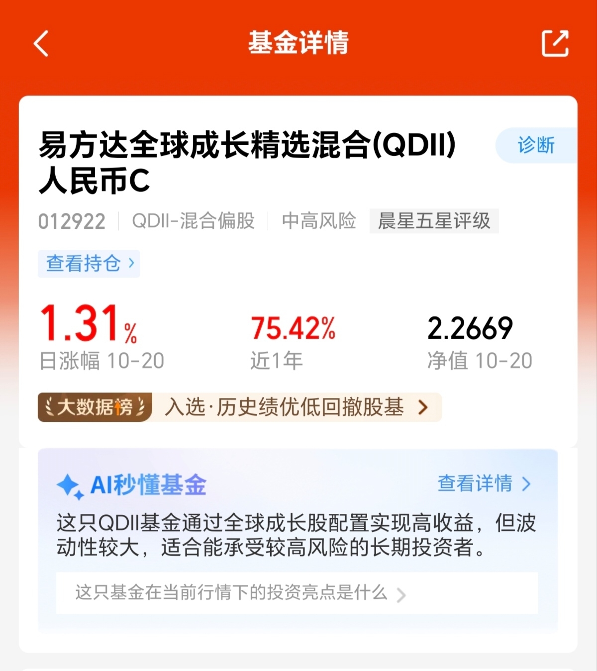 今日A股市场呈现回调趋势,截至收盘三大指数集体下跌,而大科技赛道更是涨跌互现,不过随着降息周期的开启,全球科技类长期行情还未走完,所以我会选择全球科技龙头布局,其中 易方达全球成长精选混合(QDII)人民币C主投全球科技赛道,把握多个市场科技成长机遇,近一年涨幅高达75.42%,目前入选到历史绩优低回撤股基榜单中,可见其实力所在,我也准备慢慢定投起来了!