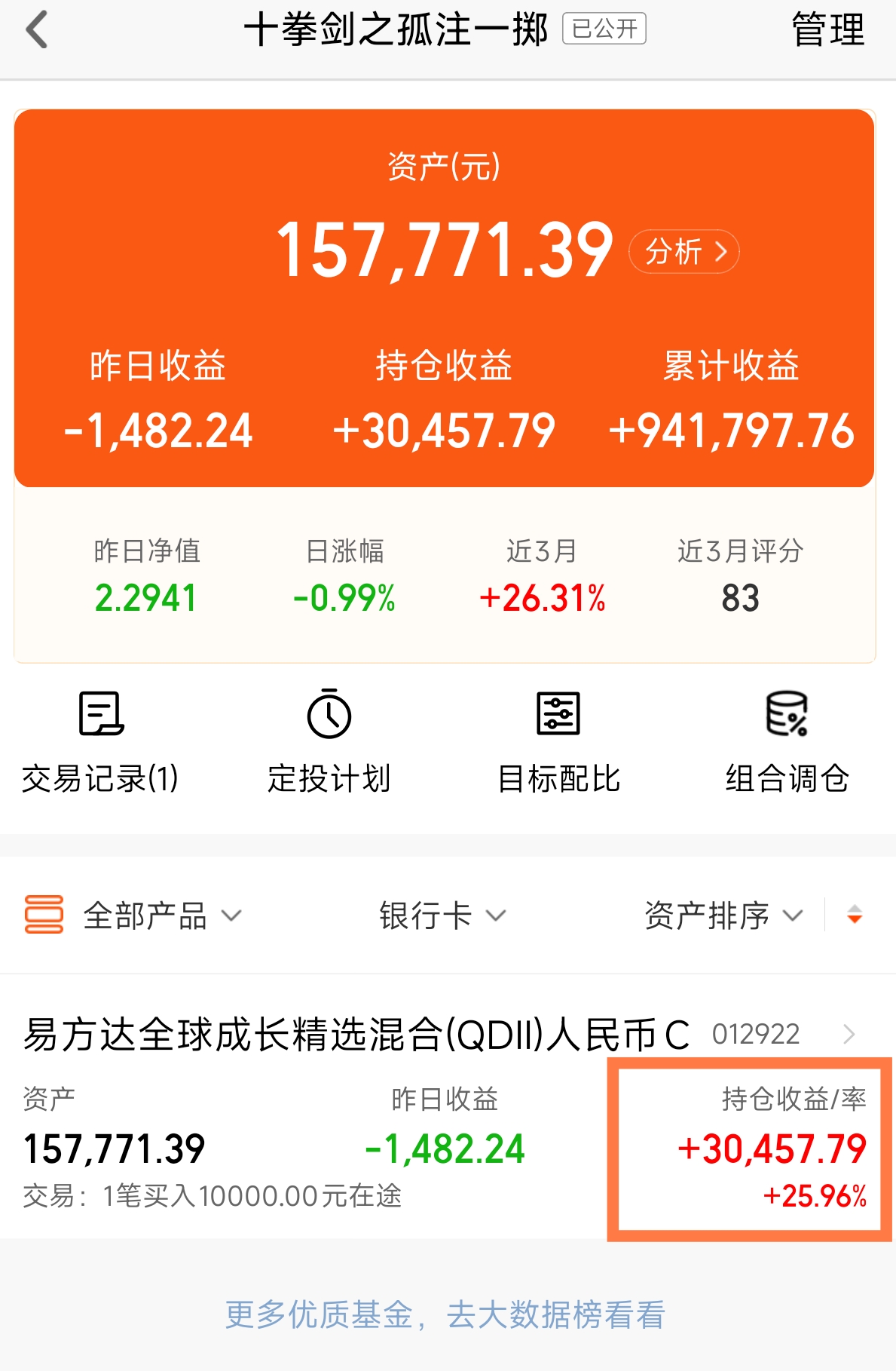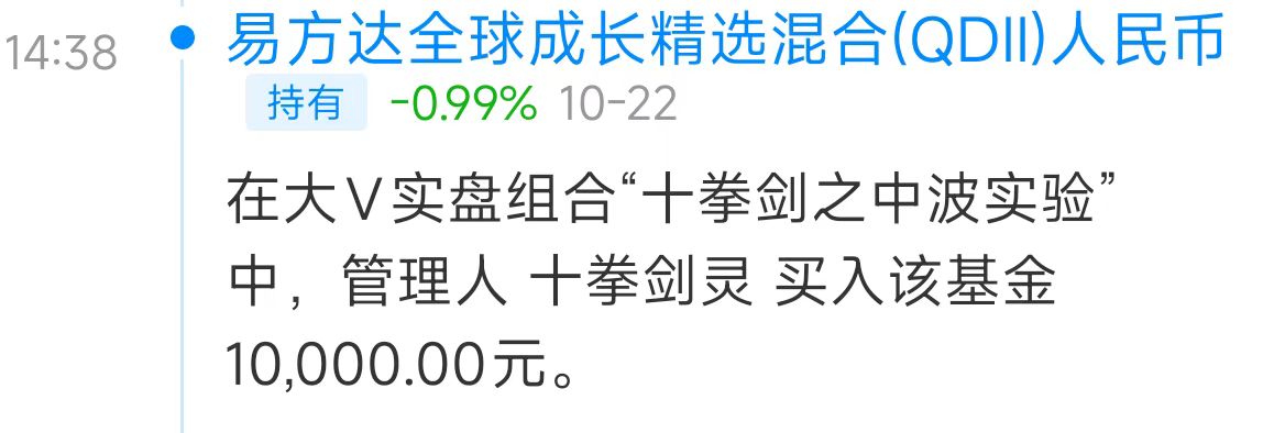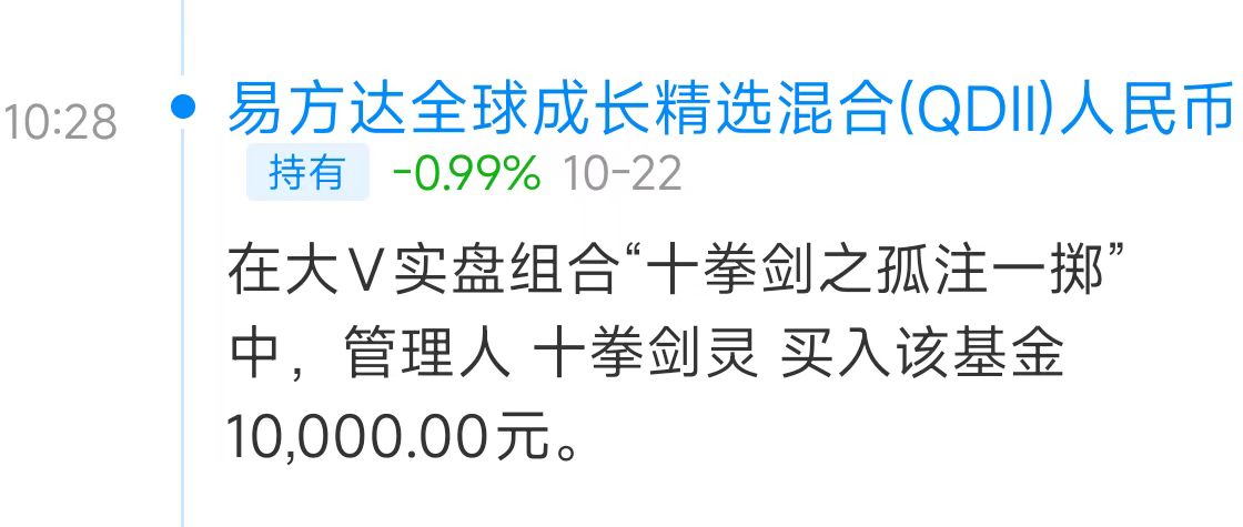 近期把一些高溢价qdii基金转场内卖出(后面会展开讲),导致基金账户中的海外权益比例下降了。现在各家的qdii普遍暂停申购或者限购100块,每天买不了多少。好在$易方达全球成长精选混合(QDII)人民币C(OTCFUND|012922)$的每日额度有1万元,相对充足,所以连续两天定格申购1万元,分别加到了十拳剑之中波实验和十拳剑之孤注一掷两个公开组合中。如果已经将易方达全球成长加入自选的话,就会在天天基金app的“自选大事”中看到如下消息: