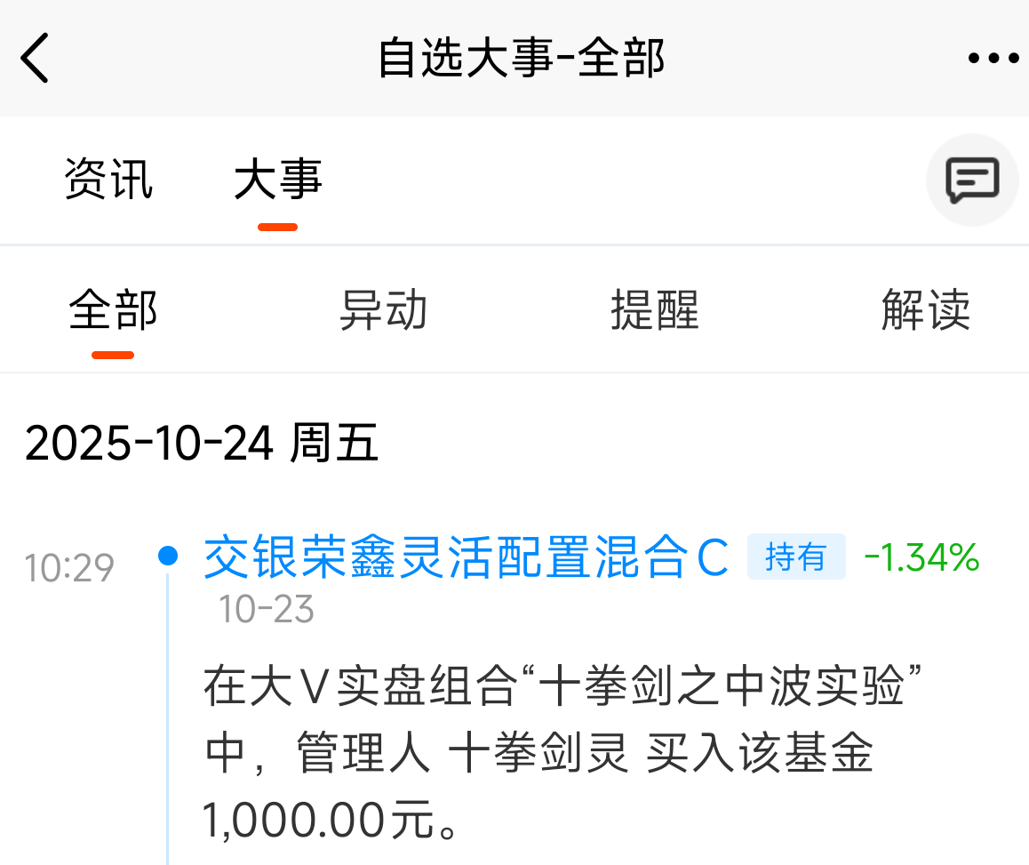 交银荣鑫涨势稳健,最近没有等到大幅回撤的时机,还是每周分批加仓吧。今天在十拳剑中波实验这个公开实盘中加仓了1000交银荣鑫。如果已经将产品加入自选的话,就会在天天基金app的“自选大事”中看到如下消息: