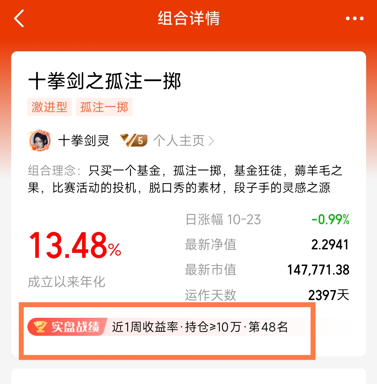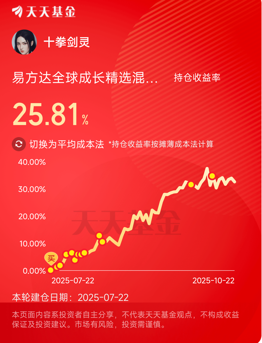 自从7月建仓易方达全球成长以来,涨势非常稳健,收益率25.81%。连带着将孤注一掷组合的收益率、夏普率等指标都大幅度提升了。不多说,上图!大家也可以在我的个人主页里查看这个公开实盘组合,不忽悠!