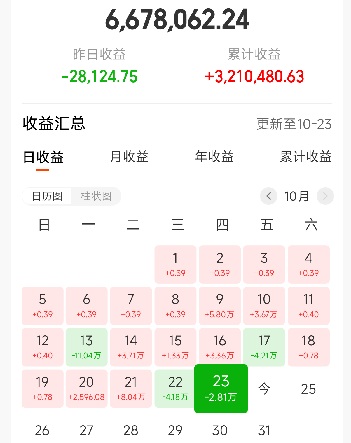 黄金ETF这几天大跳水,账户已经连续跌了两天了,累计收益回落至321万。好在黄金的配置比例是10%左右,不算很大,同时红利等其他类型的资产有所上涨,所以还能继续睡安稳觉。