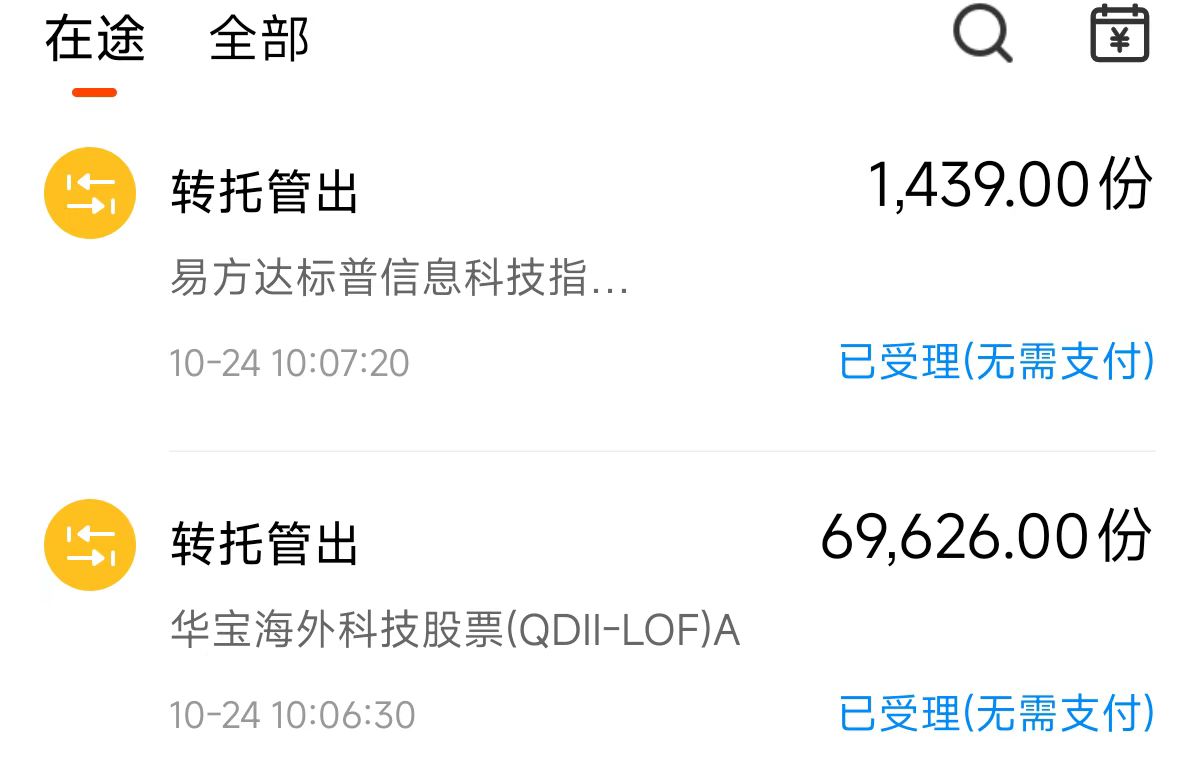 看到这么高的溢价有点心动,我开始将部分场外的$华宝海外科技股票(QDII-LOF)A(OTCFUND|501312)$转托管到场内交易。操作上简单来说就是通过券商办理转托管手续,把场外份额转到场内卖出,赚取净值与交易价格的差额。不过这种操作需要密切关注溢价变化,因为高溢价可能随时消失,而且转托管期间市场波动也会影响最终收益。