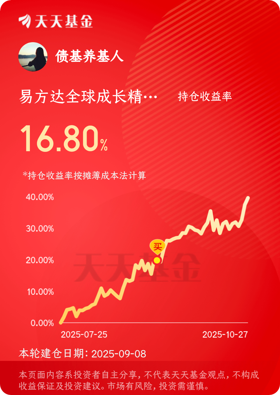 不过我还是打算继续加仓$易方达全球成长精选混合(QDII)人民币C$ #晒收益# ,该基投资全球科技,避免局部地区风险,不仅走势稳定,抗回撤能力强,基金经理阳光毒辣,而且收益还特别好。