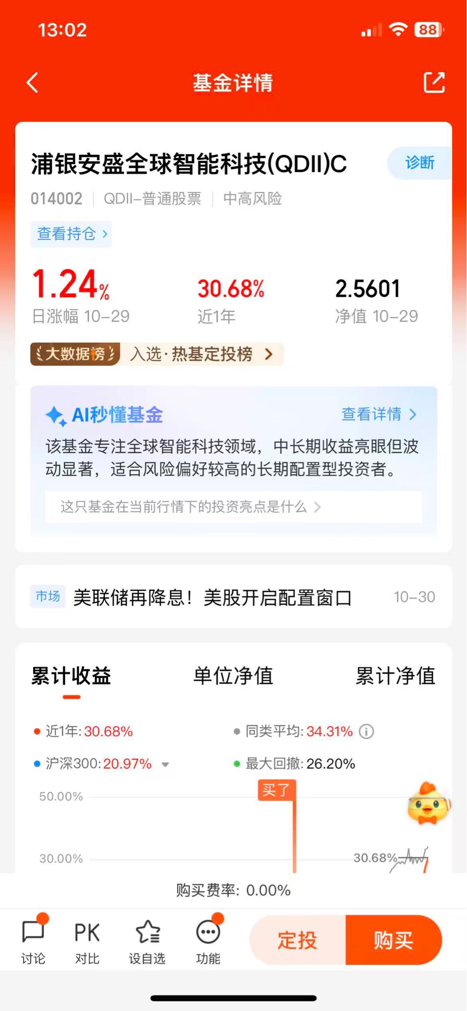 目前定投美股市场或仍是大多数人实现财富快速增长的最优途径,我选择$浦银安盛全球智能科技(QDII)C$ 完全不限购收益还稳定
