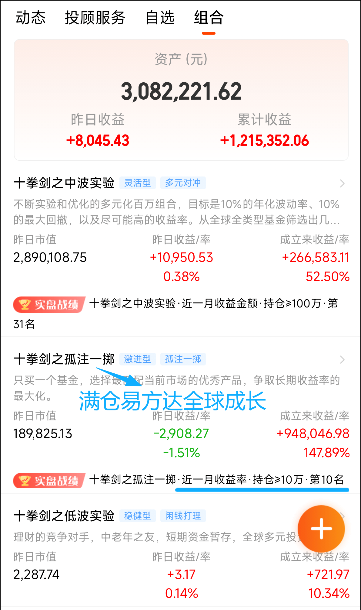 因为这种灵活性,我才敢把它作为十拳剑之孤注一掷组合的唯一持仓。靠着易方达全球成长,组合近一月收益率在所有持仓10万以上的组合中,排名第10。