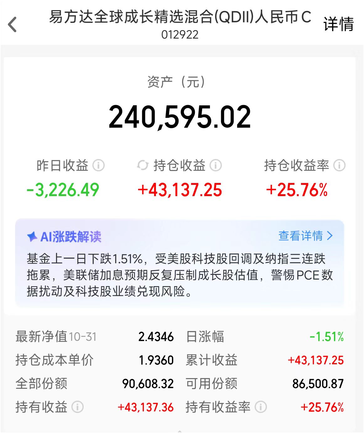 近期把一些高溢价qdii基金转场内卖出,导致基金账户中的海外权益比例下降了。现在各家的qdii普遍暂停申购或者限购100块,每天买不了多少。好在 $易方达全球成长精选混合(QDII)人民币C(OTCFUND|012922)$ 的每日额度有1万元,相对充足,所以继续每天顶格加仓一万,预计持续两周左右。最近连续加了8万,持有的总金额超过了24万。
