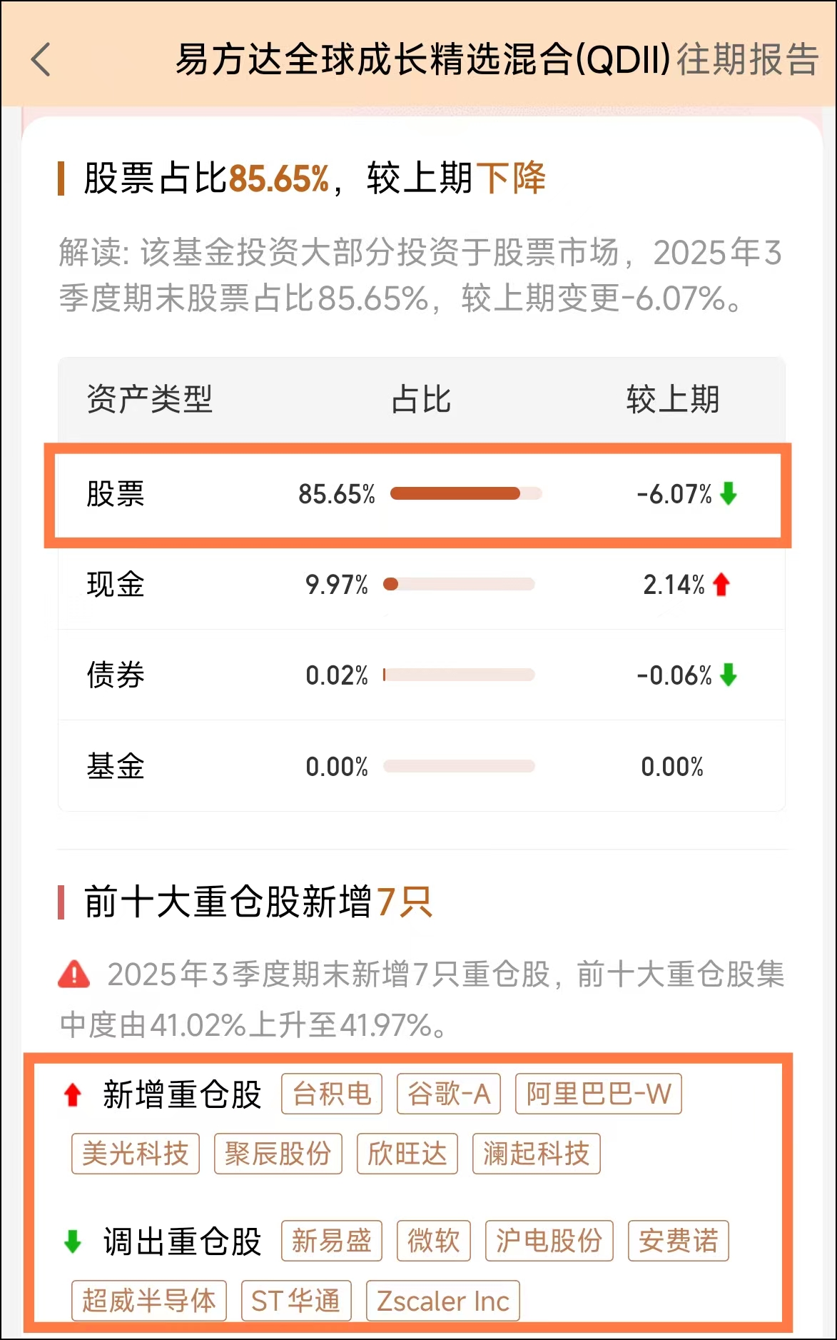 易方达全球成长发挥了QDII的灵活性优势,持仓不局限于美股或者A股、港股,基金经理郑希在区域上进行了分散与切换。例如2025年一季度优先布局港股估值修复机会,二季度迅速转向美股 AI 等高景气赛道。