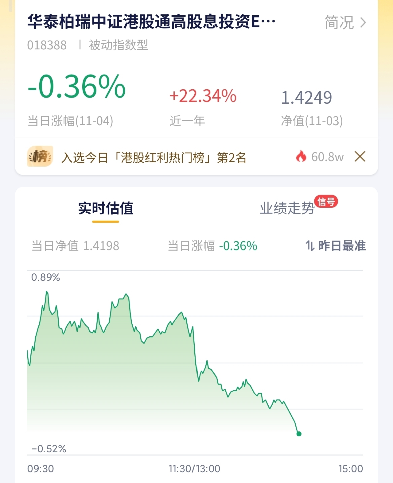 聊起现在的市场,好多人都觉得没方向,追热点怕被套,持现金又不甘心。但看最近的行情就知道,红利板块一直在悄悄发力,毕竟分红摆在那儿,心里有底。特别是港股通里的那些红利股,股息率着实诱人,还有估值修复的空间。不想折腾的话,直接选华泰柏瑞的产品就行,它专门做这个方向,跟着指数走,不用担心里程碑式的操作,稳稳当当跟着行情走。$华泰柏瑞港股通红利ETF联接基金C$