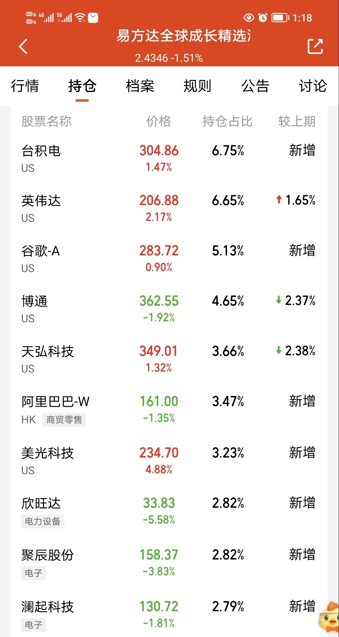 全球科技:我今天继续加仓$易方达全球成长精选混合(QDII)人民币C$ 10000元。这支基金是一支面向全球股市的混合偏股型基金。目前重点布局了美科技股如台积电、英伟达、谷歌、博通、天弘科技、美光科技等,也适当布局了港股如阿里巴巴等以及A股的欣旺达、澜起科技等,可以说将全球科技巨头一键打包,轻松布局。
