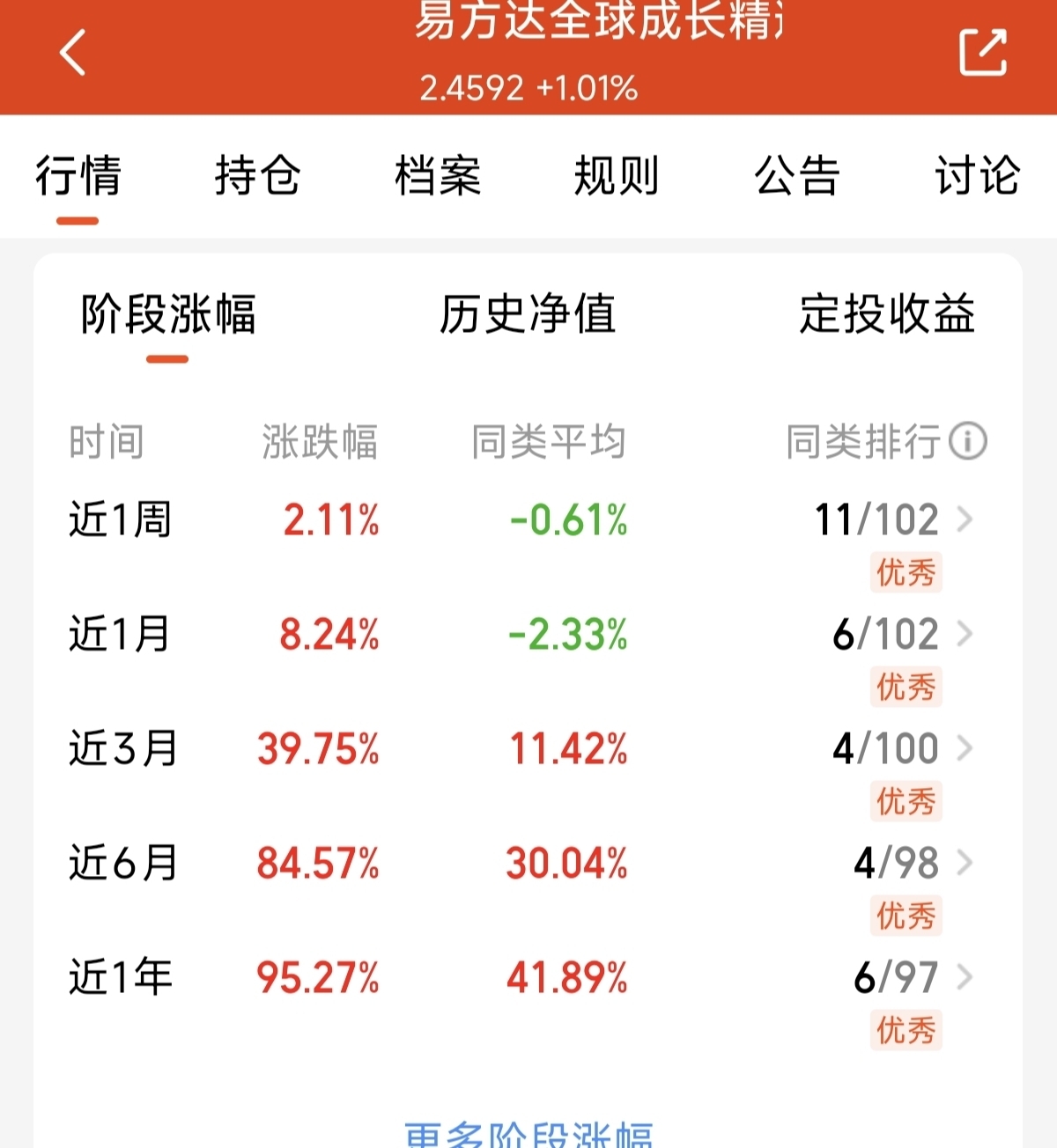 目前整体来看,在全球市场中,还是科技的表现比较强,随着美联储降息打开,美股科技直接受益。A股的算力。港股的互联网都有可能受到带动,$易方达全球成长精选混合(QDII)人民币C$ 这只主动的科技基金。通过投资a股,港股,美股多地来把握全球科技机会,近3月上涨了39.75%,近一年涨幅95.27%一直在创新高。我继续看好长期的收益表现。